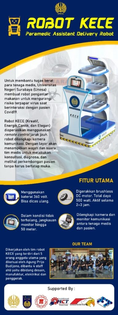 Agung Prijo Budijono, S.T, M.T pembina tim pembuat robot KECE mengatakan, robot hasil kreasi timnya tersebut dilengkap dengan komunikasi berbasis video yang dapat menunjang kinerja tenaga medis dari jarak jauh.