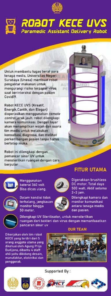 Maspiyah menambahkan, Robot KECE dengan dua fungsi yakni membawa obat dan menyeterilkan ruangan ini, merupakan temuan terbaru. Jika sebelumnya muncul robot yang bisa membawa obat sendiri, dan robot yang menyeterilkan ruangan sendiri, maka Robot KECE Unesa bisa melakukan kedua hal tersebut.